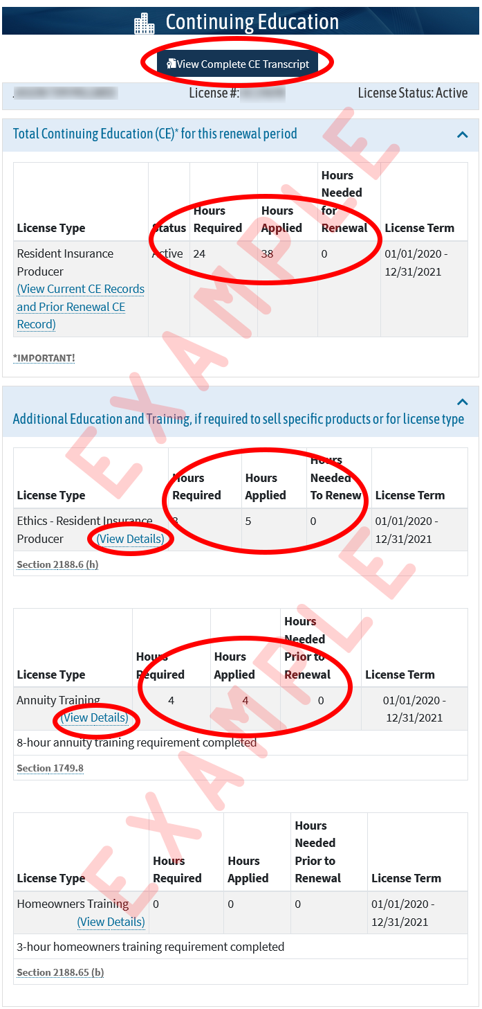 You will be taken to the CA DOI website to view your CE requirements. Look over this page as it will show you based on your license what you need to complete your continuing education. Each license type will show you the hours required, hours applied (already completed), and how many hours you have left to finish that requirement.